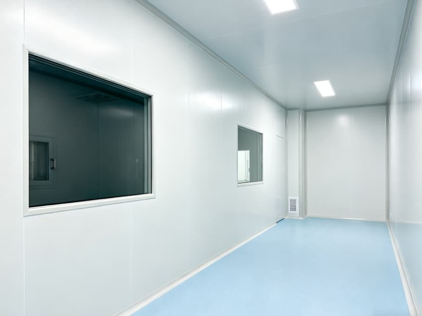 內部按功能劃分為六大潔凈區域:核心潔凈生產區(淺藍色防滑防霉地面)預留開闊空間,滿足發酵罐、純化設備等后期安裝;頂部潔凈送風區通過規整風閥系統,實現萬級潔凈度均勻送風;墻面過渡區采用圓弧轉角設計,避免粉塵堆積;密閉觀察區設雙層鋼化觀察窗,兼顧生產監控與無菌隔離;縱向設備預留區保留8米凈高,適配大型凍干設備動線;輔助緩沖區銜接車間入口,搭配風淋系統,實現人員/物料潔凈過渡。整體空曠布局既保障潔凈操作空間,又滿足皖北生物制藥企業靈活擴產需求,為本地藥企提供合規、高效的生產載體。