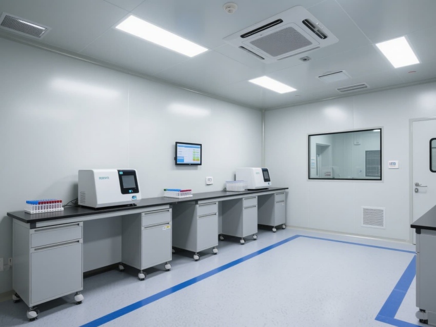 頂部高效過濾器與定向氣流系統(tǒng)維持每小時12-15次空氣置換,確保潔凈度達(dá)標(biāo)。墻面嵌入式消毒裝置與紫外燈系統(tǒng),可實(shí)現(xiàn)每日全方位消殺。實(shí)驗(yàn)區(qū)配備負(fù)壓通風(fēng)柜與生物安全柜,臺面采用耐腐蝕環(huán)氧樹脂材質(zhì),適配PCR反應(yīng)的精密操作。