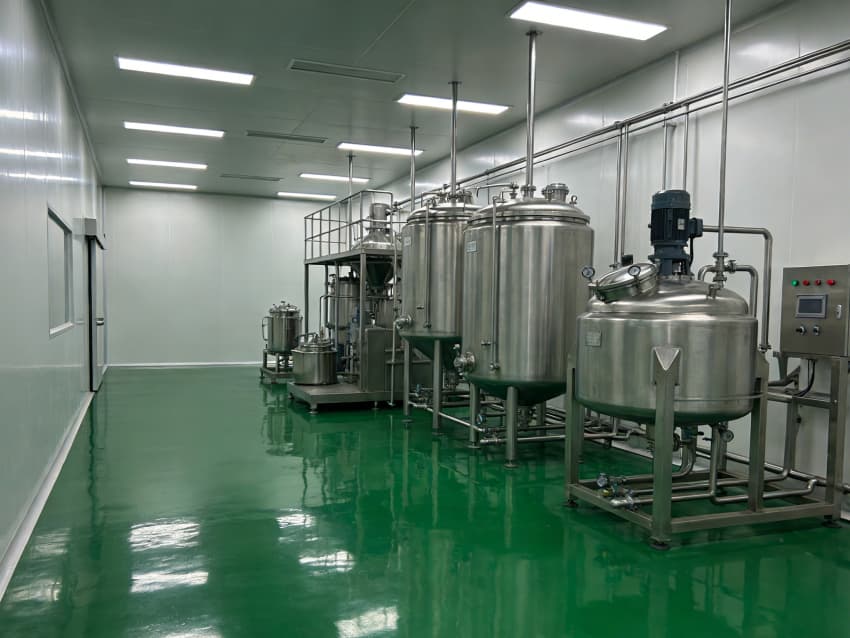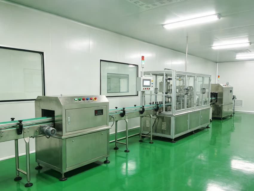 整體空間采用醫藥級潔凈圍護體系:墻面與頂板選用抗菌型潔凈彩鋼板,搭配圓弧角收邊與密封膠條,徹底消除積塵死角;地面為綠色防靜電環氧自流平材質,表面光滑耐磨、易清潔消毒,同時具備靜電消散功能,避免靜電對藥品的潛在影響。吊頂集成 FFU 風機過濾單元與恒溫恒濕控制系統,可穩定維持十萬級潔凈度與 18-26℃的工藝環境,通過壓差管控保障各區域空氣單向流動,有效防止交叉污染。