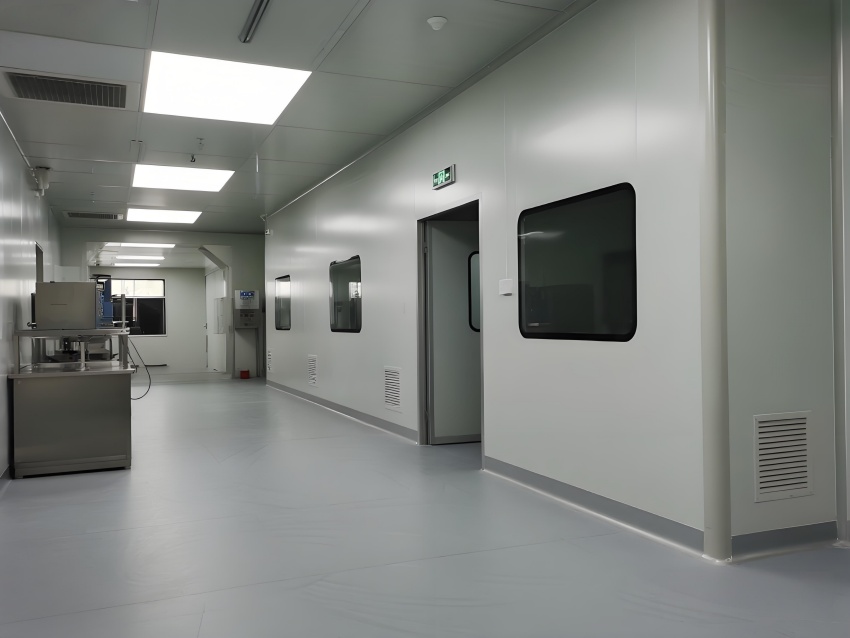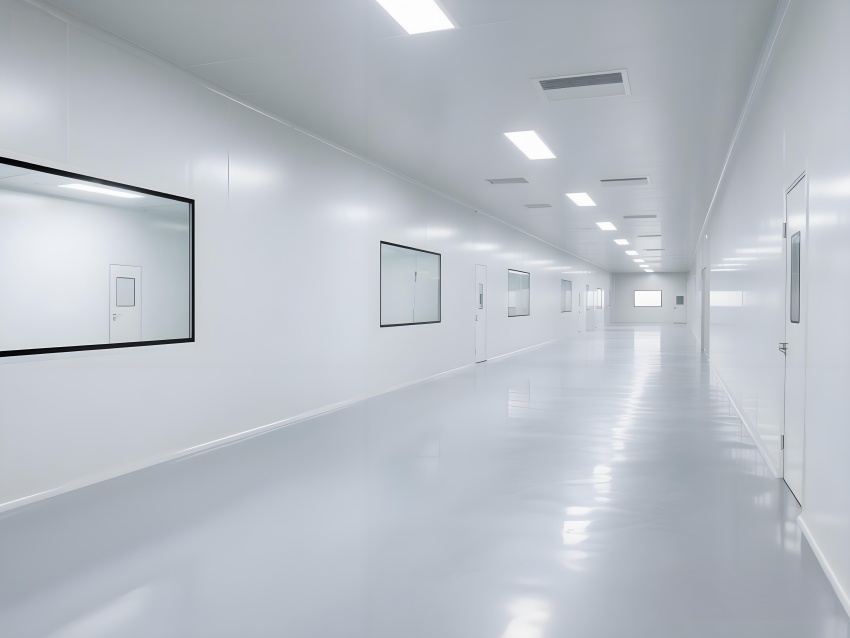 本凈化車間采用"科技極簡主義"風格,通過流暢的線性布局與模塊化設計強化專業感。主空間以珍珠白與淺灰為基調,搭配天藍色送風管道形成視覺引導,環氧地坪的鏡面效果反射頂部藍色凈化燈帶,營造無菌環境的通透感。設備區采用不銹鋼原色與玻璃觀察窗形成材質碰撞,電子屏實時數據可視化增強科技屬性。嚴格的人貨分流設計通過色彩編碼實現功能識別,墻面嵌入式消防與應急系統保持視覺平整。整體空間通過減少視覺噪點、強化功能分區線條,在滿足GMP動態潔凈要求的同時,呈現現代食品工業的精密與秩序之美,透明亞克力標識牌與柔光照明進一步減輕密閉空間的壓抑感。